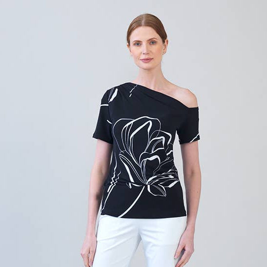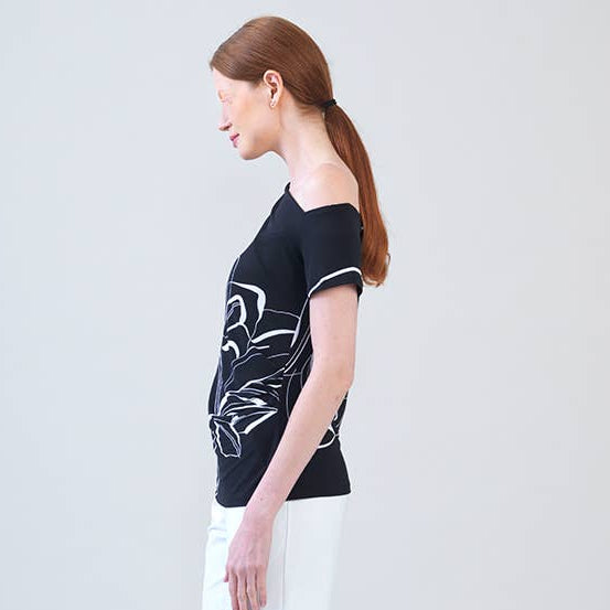 Discover effortless sophistication with the CLARA SUNWOO Floral Soft Knit Top. This striking piece features an asymmetrical off-shoulder neckline with an elegant drape, paired with a bold large-scale floral outline print in white linework against a black background. The contemporary design delivers artistic minimalism with modern edge. Crafted from their signature Carefree Travel Fabric—a luxurious poly blend knit that's soft, lightweight, and wrinkle-resistant—this top keeps you comfortable and polished whether you're traveling or everyday wear. Quick-drying and cooler than traditional fabrics, it's the perfect go-to for style without compromise.
