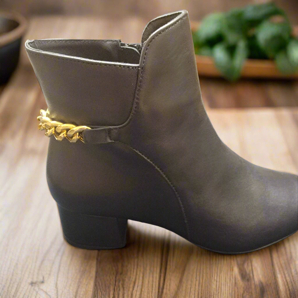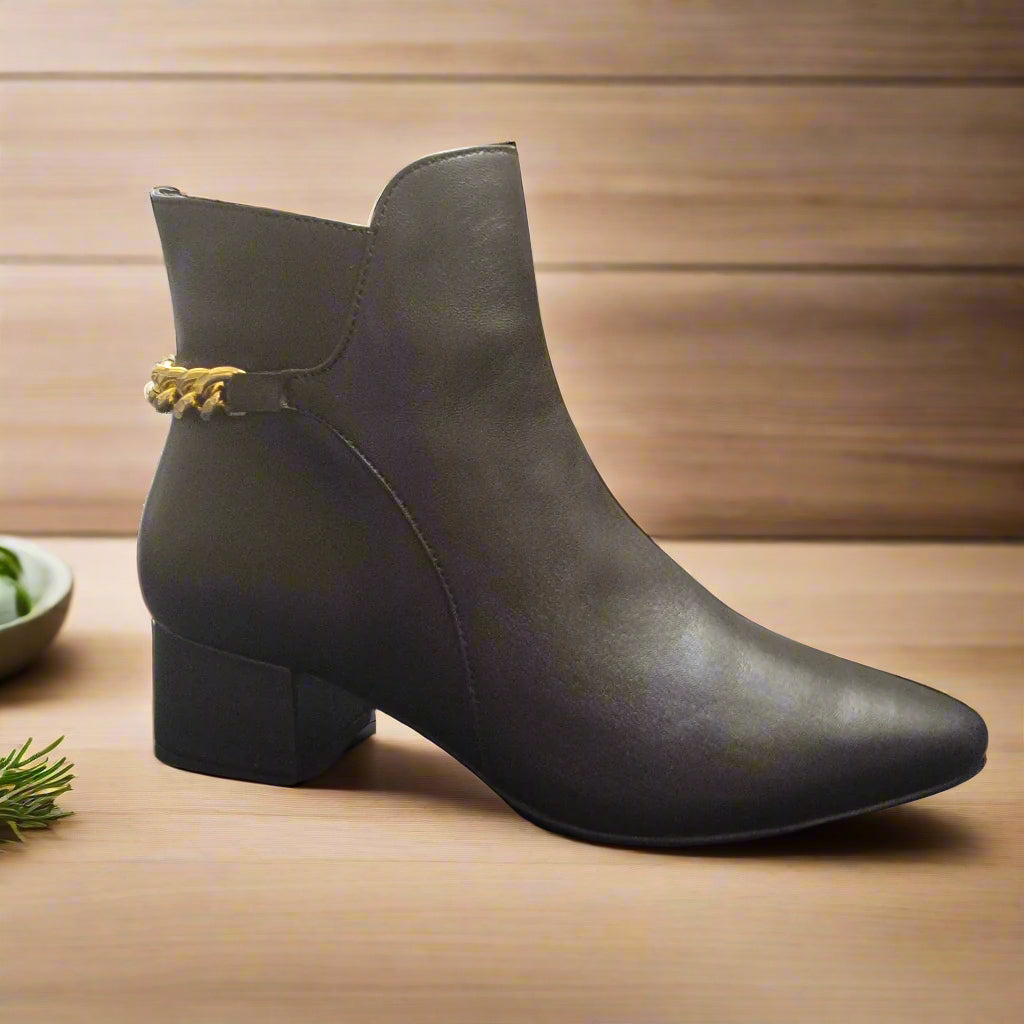 These black leather booties from Eric Michael combine style and comfort with a 2 3/4" block heel and a pointy toe featuring a wider front for all-day wear. The gold chain embellishment on the back adds a subtle touch of elegance, while the zipper ensures easy on and off. Perfect for sleek everyday styling, they effortlessly elevate any outfit while providing practical support.