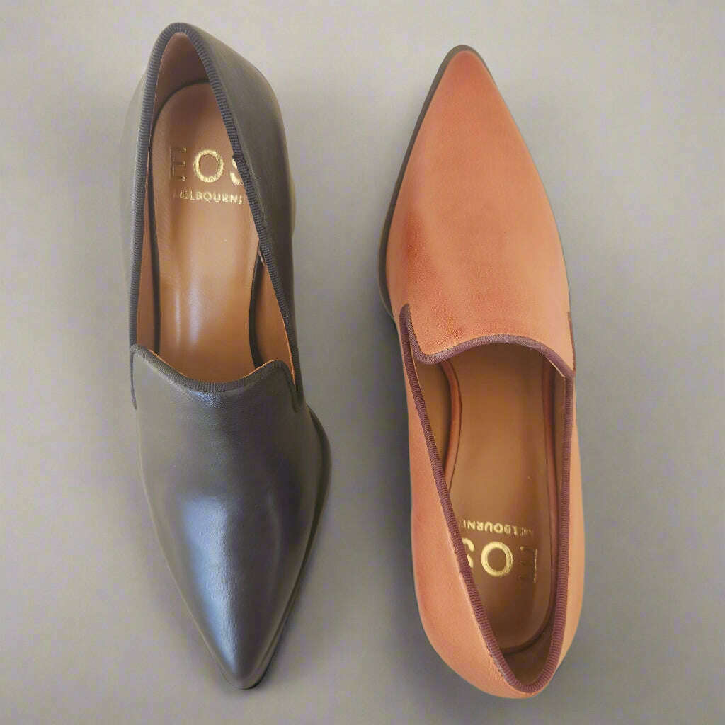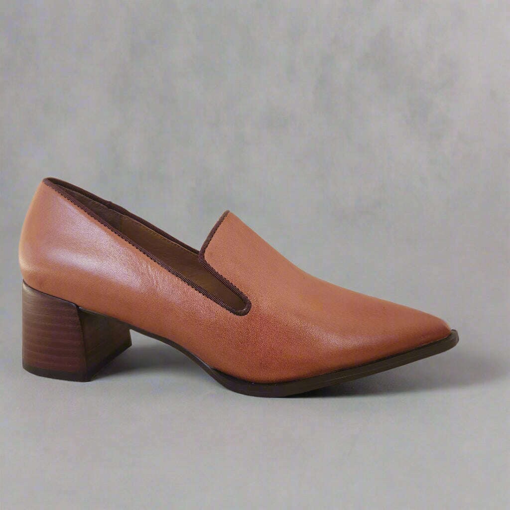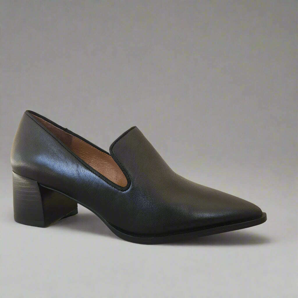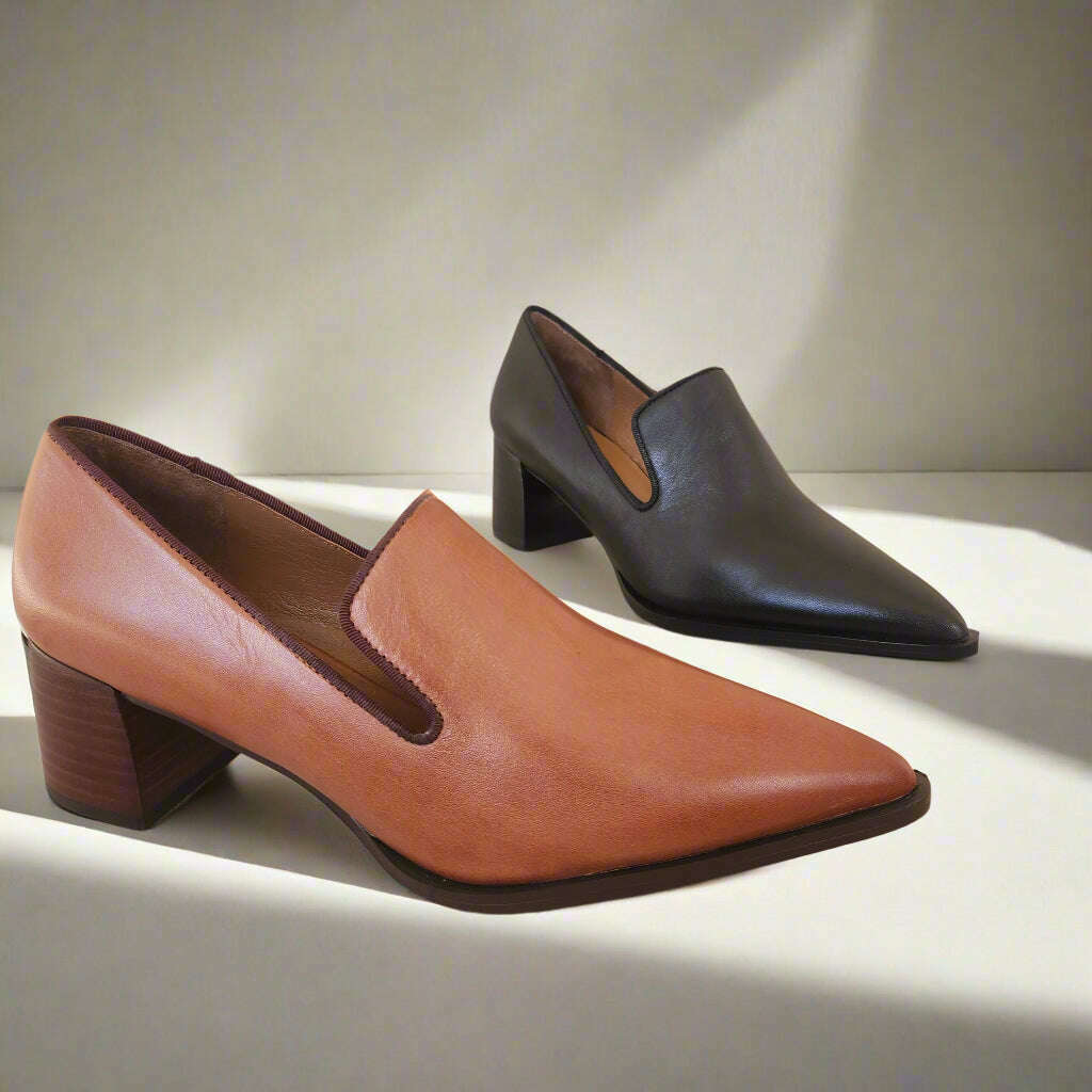 Slip into refined elegance with this leather smoking-slipper loafer — the perfect fusion of timeless design and modern polish. The sleek pointed toe creates a sharp silhouette, while the 2″ stacked wooden heel provides just the right amount of lift. Classic grosgrain ribbon trim adds understated sophistication, and the soft padded footbed ensures lasting comfort from morning to night. Whether paired with tailored trousers or a chic skirt, this loafer is crafted for women who want effortless style without compromise.