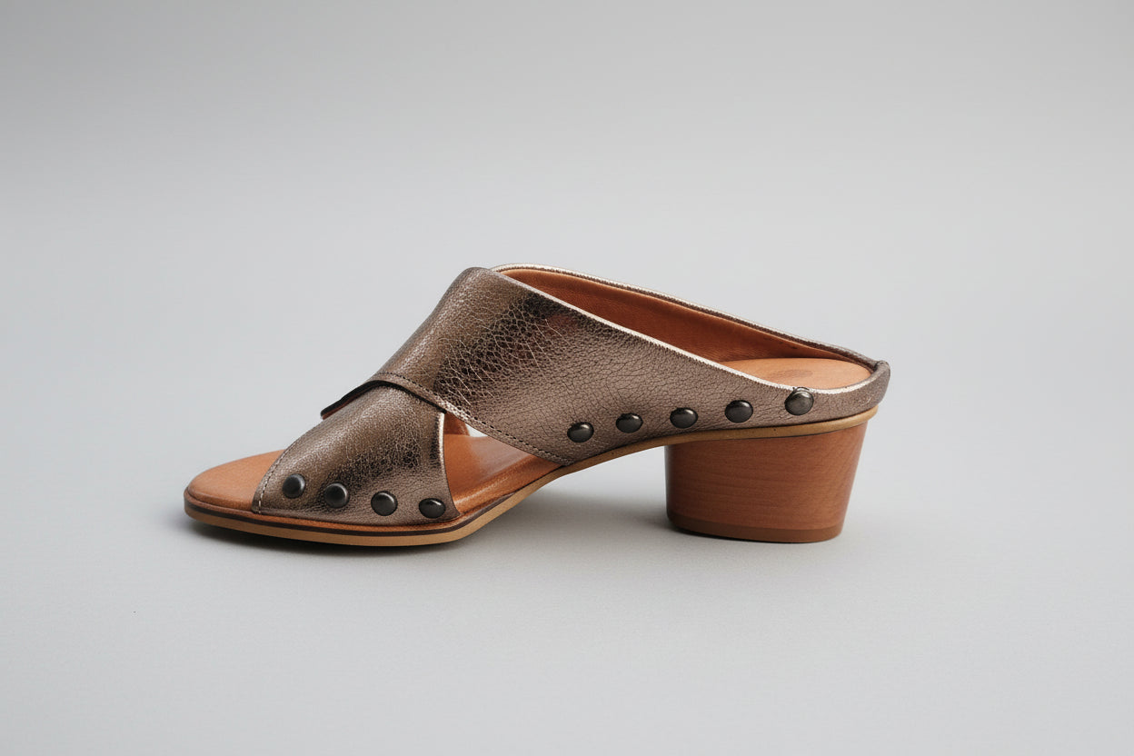 The ERIC Michael Hila—a metallic slide sandal that's equal parts glam and comfort. Supple leather gets a rebellious edge with stud detailing, while the low stacked heel keeps things grounded and walkable. The cushioned insole means you can strut from brunch to evening without your feet staging a protest. Versatile enough for casual days and polished enough for nights out.