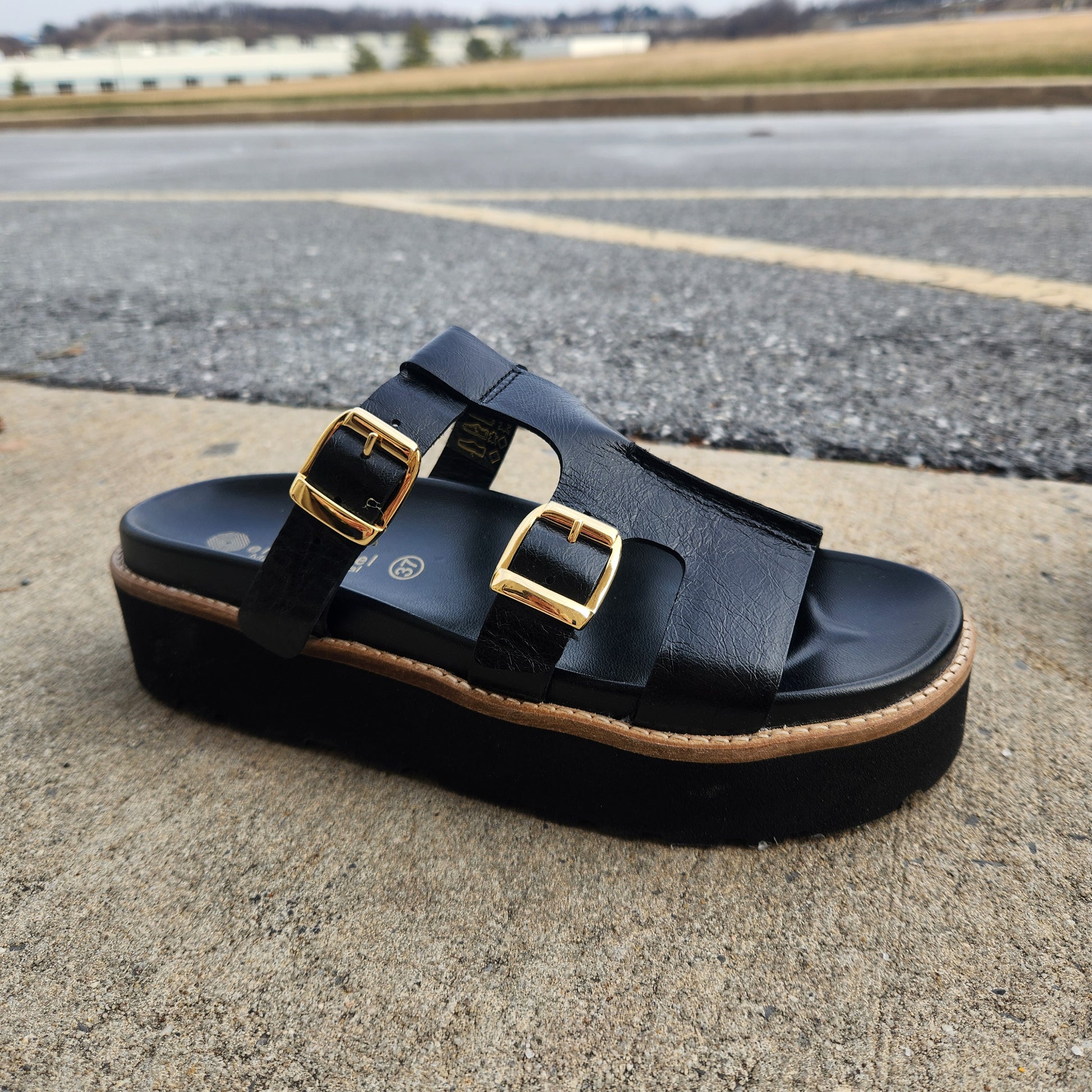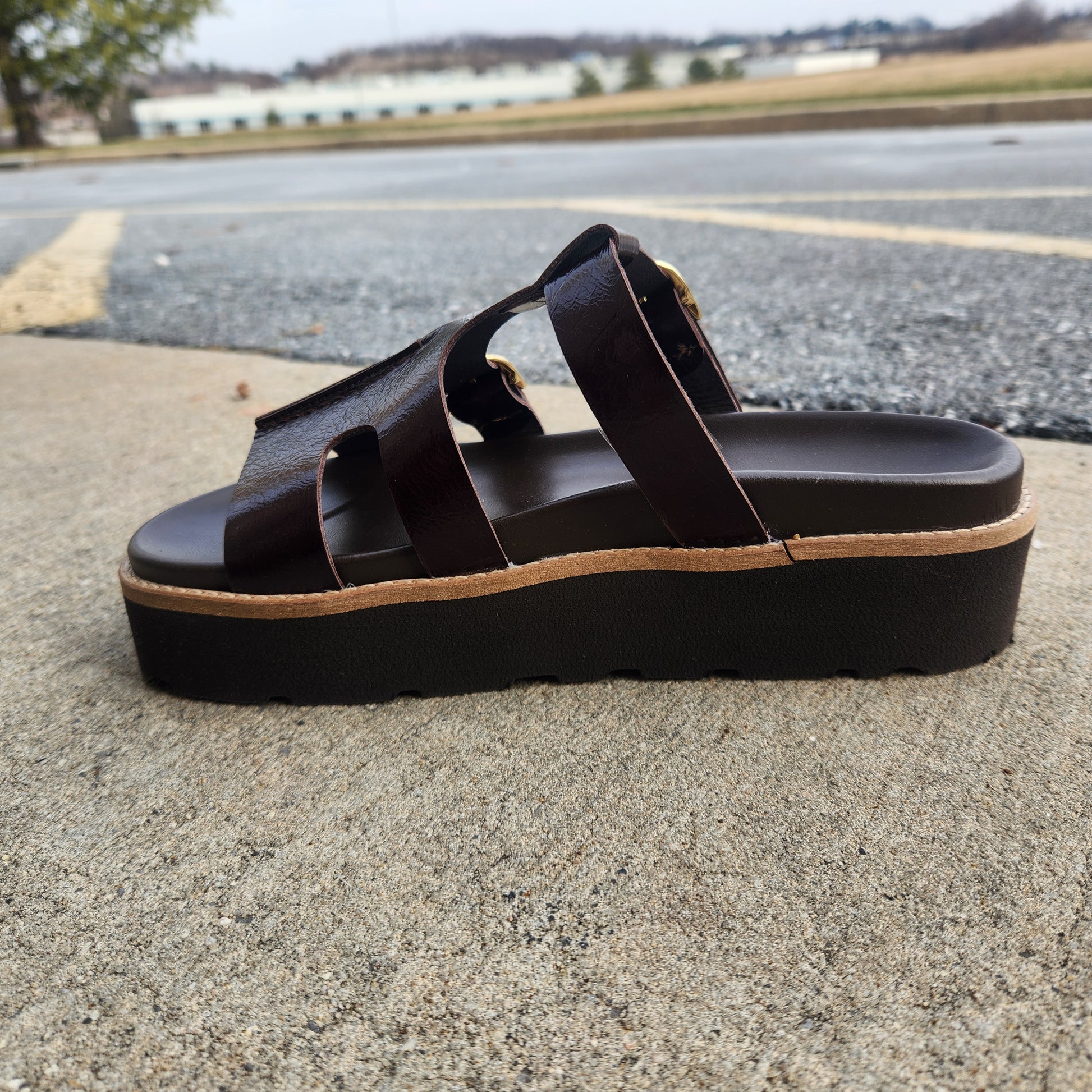 The ERIC MICHAEL Nedra Platform Sandal commands attention with its gladiator-inspired silhouette and fearless design. Dual adjustable backstraps deliver a customized fit, while the contoured footbed cradles your arch with purposeful support. Crafted from premium leather with striking gold accent buckles, this statement piece balances edge with elegance. The lightweight sole keeps you moving without compromise. Available in bold black or rich brown patent finishes—choose your weapon.