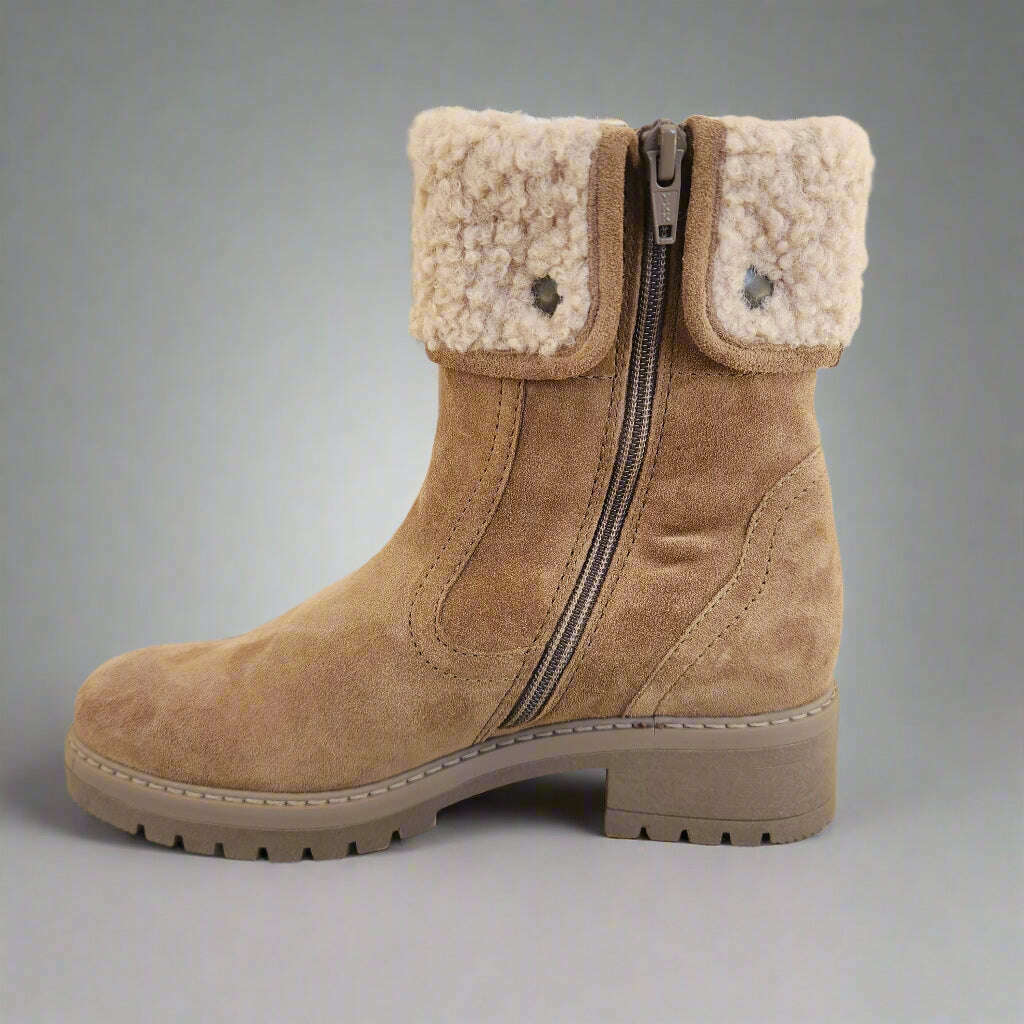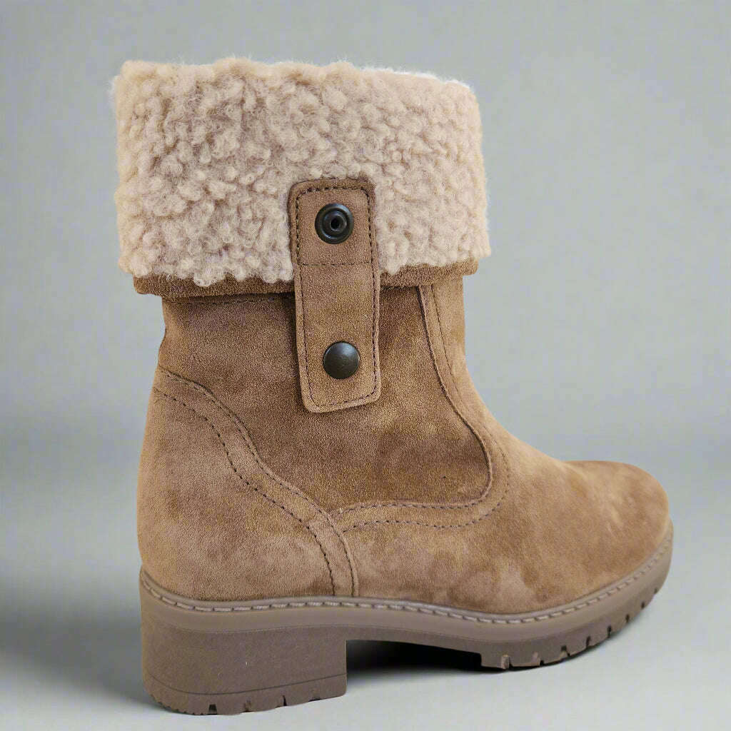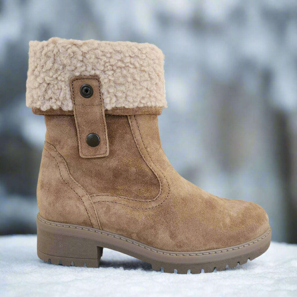 This warmly lined winter boot combines style and functionality with its versatile cuff that can be worn down to reveal the cozy fleece lining or buttoned up for a flattering mid-calf fit. Crafted from soft suede, it features a durable lug sole with excellent traction and a comfortable 3/4-inch platform paired with a 1 3/4-inch heel. An inside zipper ensures easy on and off, while the removable footbed allows for customized comfort. Perfect for keeping you warm and steady through chilly weather.