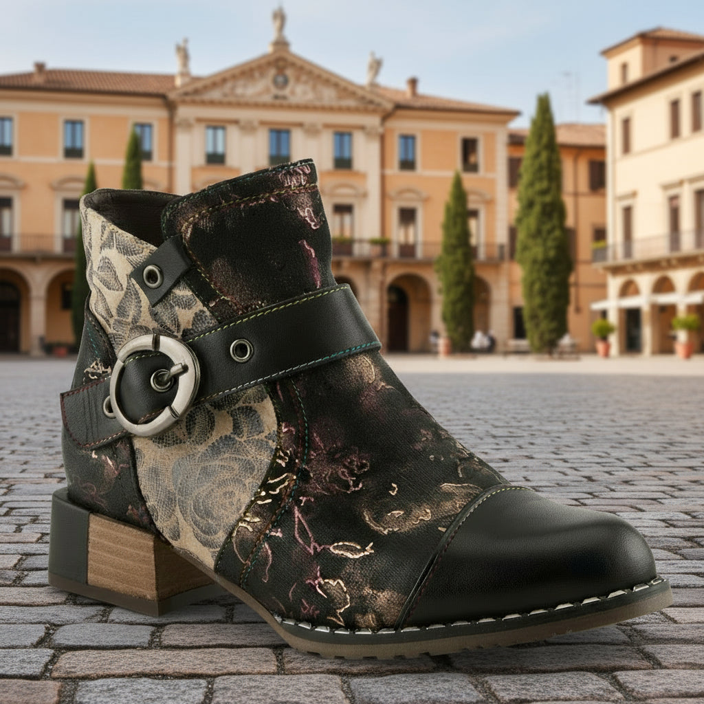 Step into a work of wearable art with the L'ARTISTE SIPPER boot. Handcrafted with meticulous attention to detail, this premium leather ankle boot is a testament to artisan craftsmanship. A fusion of old-world charm and modern chic, the design features delicate hand-painted floral motifs, distressed finishing, and elegant embossing. The timeworn appearance is complemented by contemporary flair, highlighted by a bold buckle strap and signature rainbow stitching. The sculpted, 2" stacked block heel with wrapped leather detailing adds sophistication without sacrificing comfort. A convenient inside zipper ensures easy wearability, while the plush, cushioned faux fur insole and lining provide all-day coziness and support. With a durable rubber outsole for stability, the SIPPER boot effortlessly blends fashion and function, making it a statement piece for any occasion.