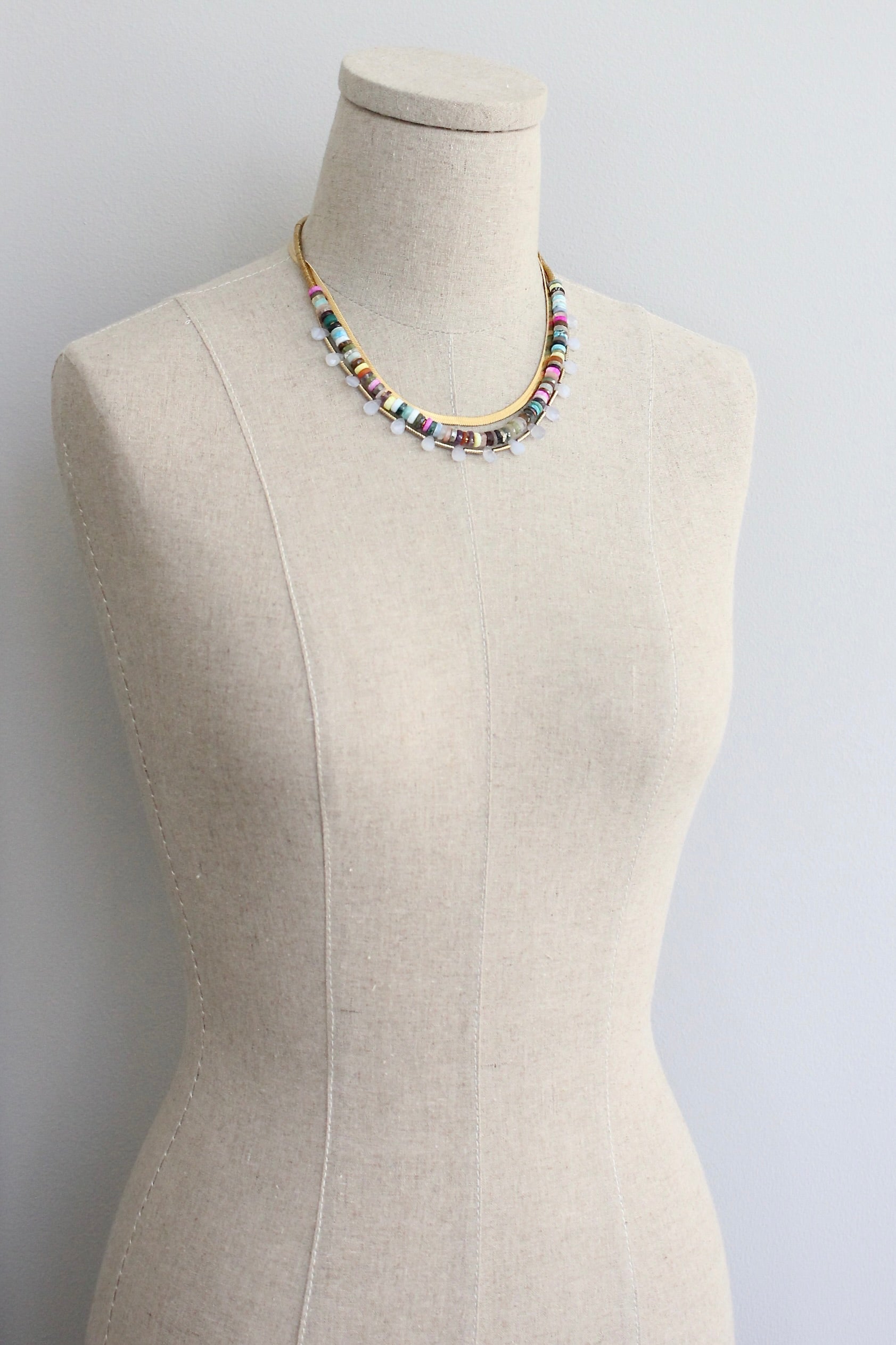 This exquisite triple strand necklace combines elegance and versatility with its multicolor design. Featuring 18k matte gold plated herringbone and snake chains, this piece is adorned with stone discs, hematite, and agate teardrops, making it a standout accessory for any occasion.