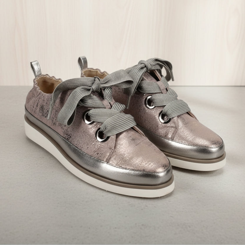 The VANELI Quenda in Metallic merges comfort with bold design. Lace up with confidence using the oversized grommets and laces that make a visual statement, while the stretch heel and leather pull ensure effortless wear throughout your day. The ultra-padded removable insole cradles your foot with cushioning support, and the sturdy 1-inch rubber sole keeps you grounded with reliable traction. Whether you're heading to the gym or running errands, this athleisure essential adapts to your lifestyle with ease and style.